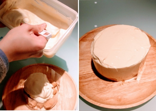 5.以浸過咖啡液的蛋捲當做基底,緩緩倒入cheese內餡。 放置冰箱冷藏一晚