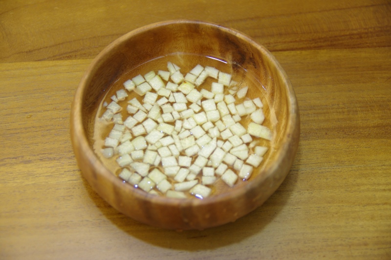 1.取將蘋果片去皮切成丁狀,可以泡鹽水,避免氧化變化,要記得儘量瀝乾。