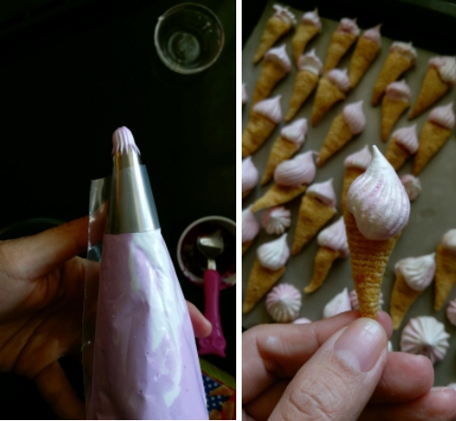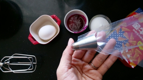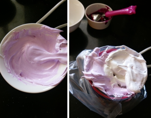 5.分別把粉色和白色的蛋白霜填入同一個擠花袋中。(如左圖)