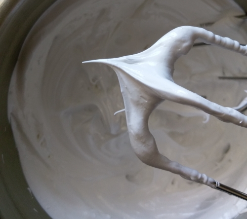 2.將蛋白放置在無油無水氣乾淨的鋼盆裡,用打蛋器打到有粗泡後加1/2的糖,泡沫變細後加剩餘的糖,一直打到蛋白霜完全硬挺至硬性發泡。這時的蛋白霜會成效美麗的珍珠色澤。