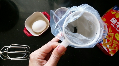 1.剪去擠花袋前段放進花嘴,再把擠花袋套進馬克杯中,方便等一下裝盛蛋白霜。
