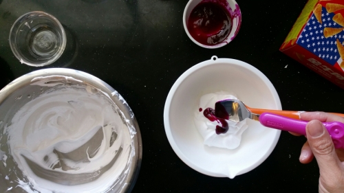 4.取一半的蛋白霜加上色膏,輕柔的混合至顏色均勻。