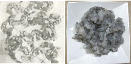 1.蝦仁買回後挑去腸泥,用鹽抓洗,沖水三次,用廚房紙巾將水分差乾後,將蝦仁切丁。