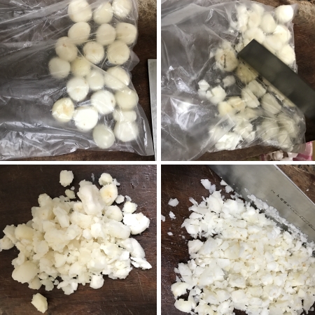 2.荸薺放在塑膠袋內用菜刀背大力拍扁後倒出來,再用菜刀直切橫切隨意切碎,之後用手將水份略為擠乾。薑與大蒜也切碎備用。