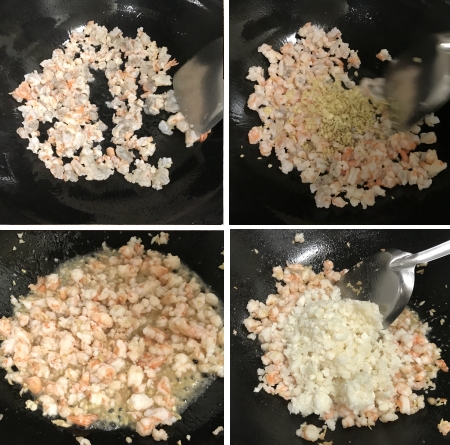 5.熱鍋加入油,放入蝦仁炒到半熟後,加入薑、蒜末拌炒,等到蝦仁快熟時,再加入荸薺末炒1分鐘,再加入鹽、胡椒調味。