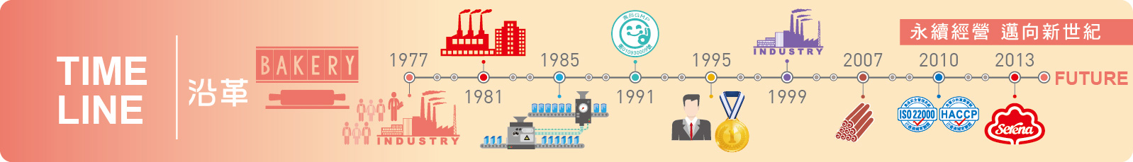 In March, the company was founded in Xinzhuang, Taipei, under the original name “Shan Hsiang Co., Ltd.”, with 14 employees. The storefront produced and sold traditional baked pastries such as peach crisps and abalone crisps. Later, Hong Kong technology was introduced, adopting gas-fired handmade egg roll techniques, and the company began the production and sales of “Serena Egg Rolls.”